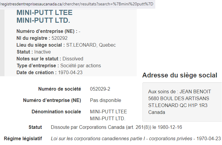 Enregistrement de la compagnie Mini-Putt Ltée dans le registre des entreprises du Canada
