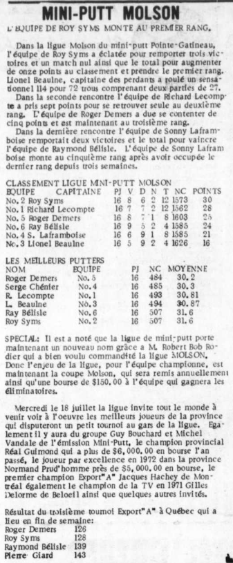 Rappel de la journée spéciale du 18 juillet où plusieurs joueurs élites sont invités à Gatineau, dont Normand Prud'homme, Réal Guimond, Gilles-Roma Delorme, Jacques Haché.