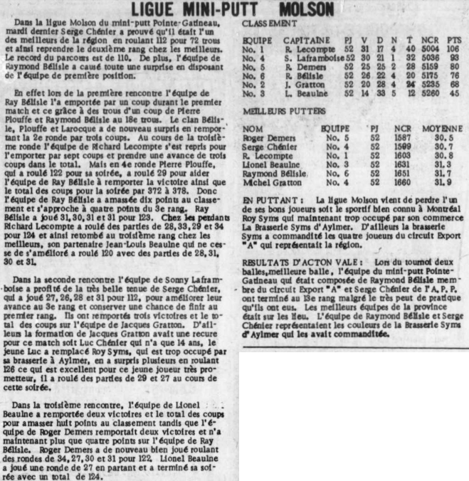 Serge Chénier joue 112. Roy Syms doit abandonner la ligue, puisqu'il est trop occupé à sa brasserie d'Aylmer. Résultats du tournoi 2 balles meilleure balle tenu à Acton Vale.