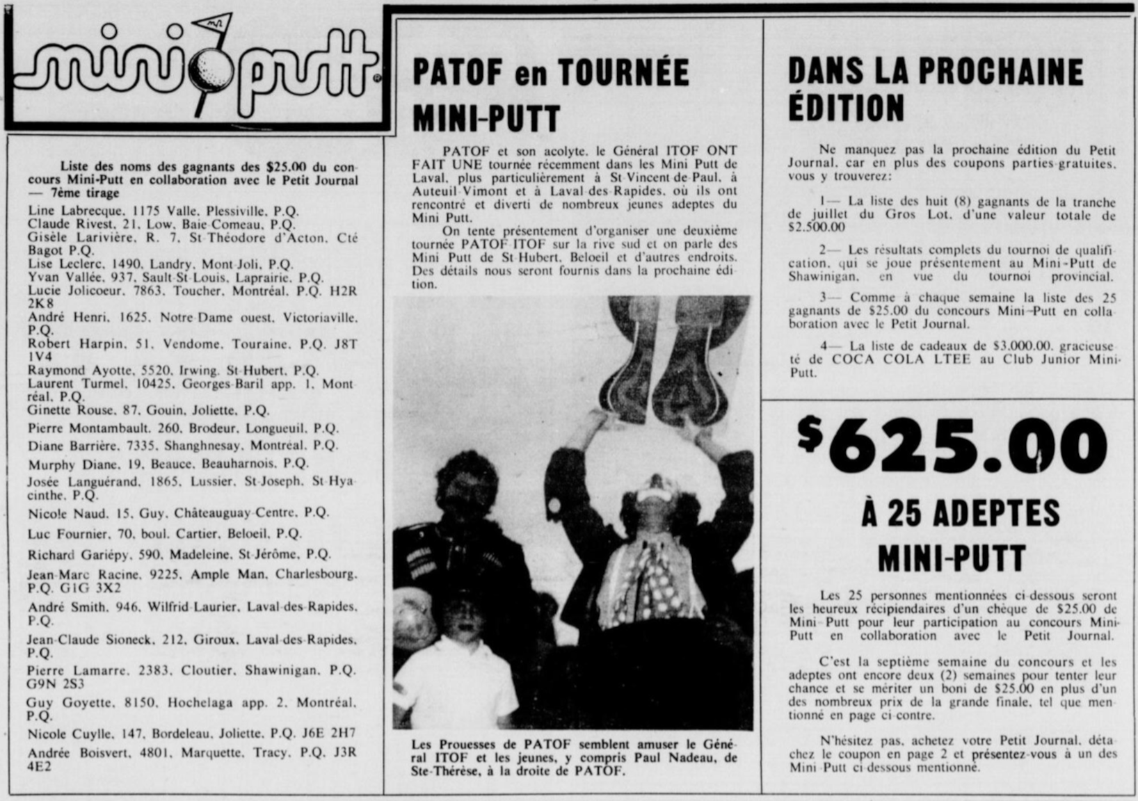 Sujet: Tournée du clown Patof à travers plusieurs mini-putts de la province. Plusieurs prix en argent distribués à travers les participants.