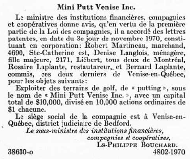 Sujet: Mini Putt Venise Inc. est fondée avec le but de construire des succursales sur la rive sud de Montréal. Robert Martineau de Brault & Martineau a joué un rôle très important dans le développement de la marque Mini-Putt