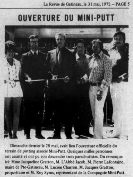 Dimanche dernier le 28 mai, avait lieu l'ouverture officielle du terrain de putting associé Mini-Putt. Quelques milles personnes ont assisté et ont pu voir descendre trois parachutistes. On remarque ici: Mme Jacqueline Gratton, M. L’Abbé Jacob, M. Pierre Lafontaine, maire de Pte-Gatineau, M. Lucien Charron, M. Jacques Gratton,