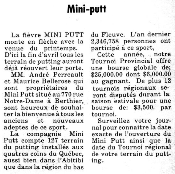 La fièvre MINI PUTT monte en flèche avec la venue du printemps. D'ici la fin d’avril tous les terrain de putting auront déjà réouvert leur porte. MM. André Perreault et Maurice Bellerose qui sont propriétaires du Mini-Putt situé au 770 rue Notre-Dame à Berthier, sont heureux de souhaiter la bienvenue à tous les anciens et nouveaux adeptes de ce sport.