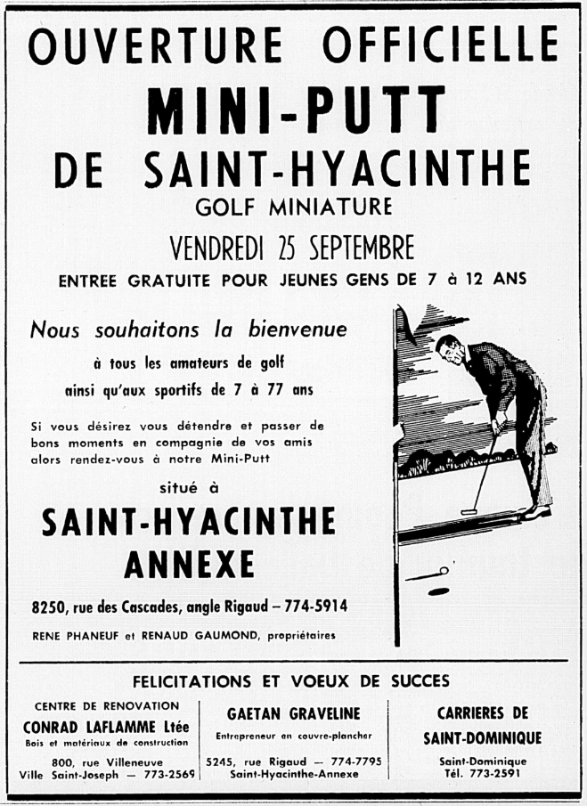 Si vous désirez vous détendre et passer de bons moments en compagnie de vos amis, alors rendez-vous à notre Mini-Putt situé à SAINT-HYACINTHE ANNEXE 8250, rue des Cascades, angle Rigaud - 774-5914 RENE PHANEUF et RENAUD GAUMOND, propriétaires