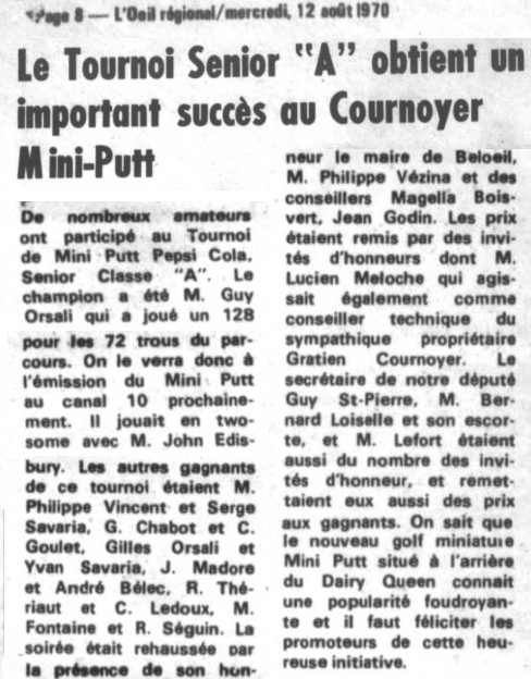 champion a été M. Guy Orsali qui a joué un 128 pour les 72 trous du parcours. On le verra donc à I'émission du Mini-Putt au canal 10 prochainement. Il jouait en twosome avec M. John Edisbury. Les autres gagnants de ce tournoi étaient M. Philippe Vincent et Serge Savaria, G. Chabot et C. Goulet. Gilles Orsali et Yvan Savaria, J. Madore et André Béiec. R. Thériaut et C. Ledoux. M. Fontaine et R. Séguin. La soirée était rehaussée par la présence de son honneur le maire de Beloeil, M. Philippe Vézina et des conseillers Magella Boisvert, Jean Godin. Les prix