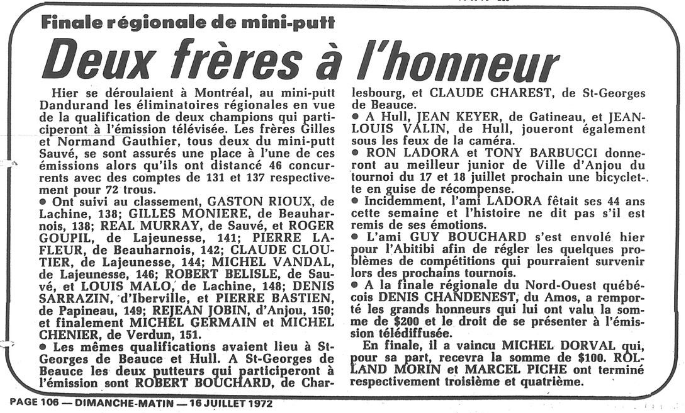 Mini-Putt: Régional - Québec-est (1972-07-15) à Saint-Georges-de-Beauce gagné par Robert Bouchard/Claude Charest