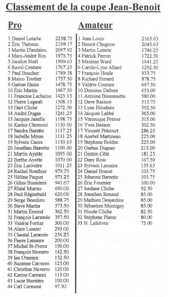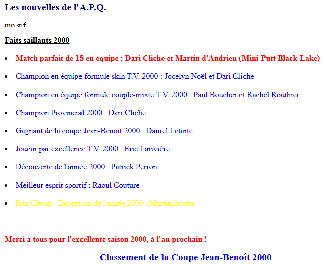 📝Site miniputt.net de l'APQ (janv. 2001) qui déclare Daniel Letarte gagnant. Classement précédent la dernière fin de semaine d'activité à Sainte-Julie.