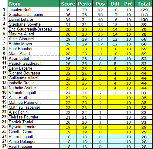 Tableau des pointages en simple. Formule birdie seulement en mode 2 balles, meilleure balle
