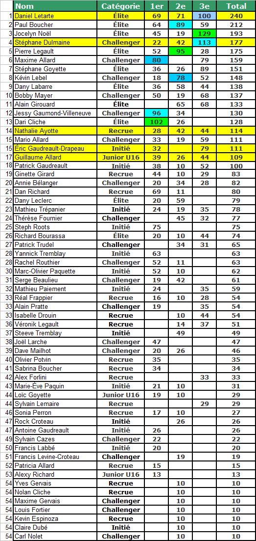 2025-06-29 à Grandes-Piles: (classe Intermédiaire-1) Maxime Allard (57.50$), Éric Gaudreault-Drapeau (57.50$) et Bobby Mayer (25$)