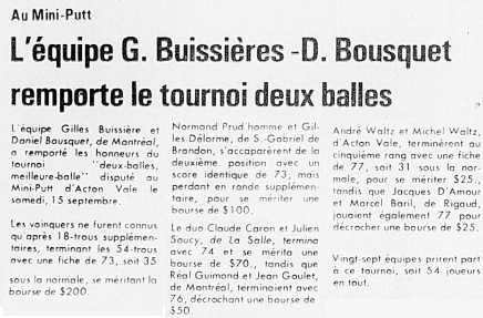 📝Gilles-Roma Delorme et Normand Prud'homme tentent de défendre leur titre, mais perdent après 18 trous de prolongation. Les locaux André et Michel Waltz couronnent leur saison 73 en rivalisant contre les meilleurs joueurs de la province. Il s'agit malheureusement du dernier tournoi d'envergure du propriétaire René Phaneuf, qui comme plusieurs, quittera le monde du mini-putt durant l'hiver 73-74. Les bourses anémiques de ce tournoi annonçaient le début de la fin pour plusieurs.