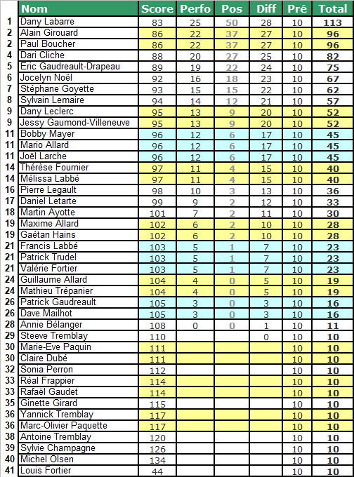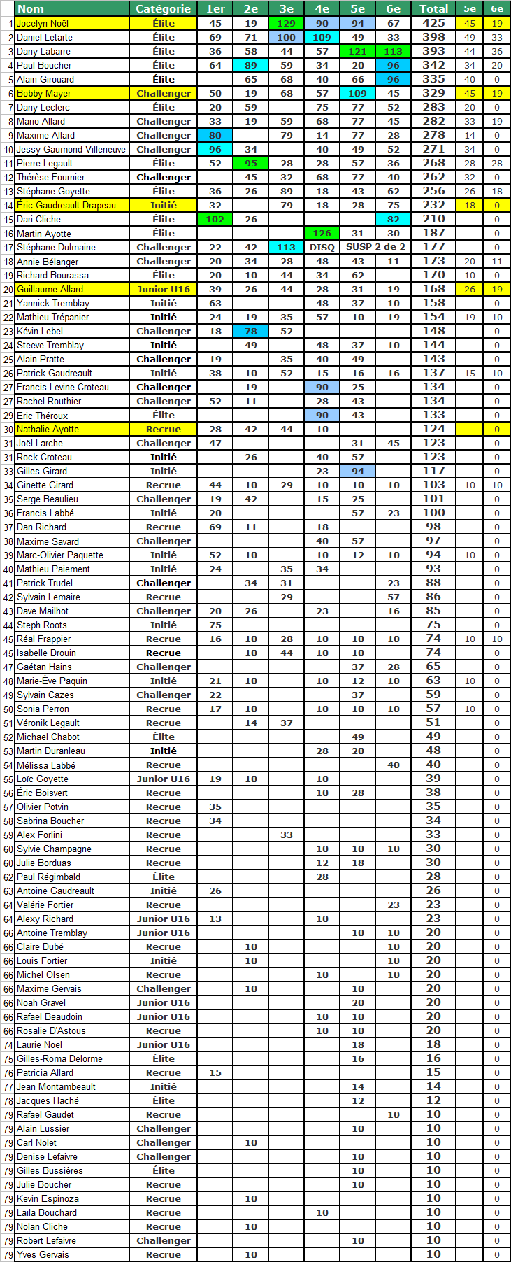 Classement de la Coupe des Bâtisseurs après 6 tournois. Le 6e meilleur pointage n'est pas additionné, le 5e pointage est celui à battre pour améliorer votre total à Vanier