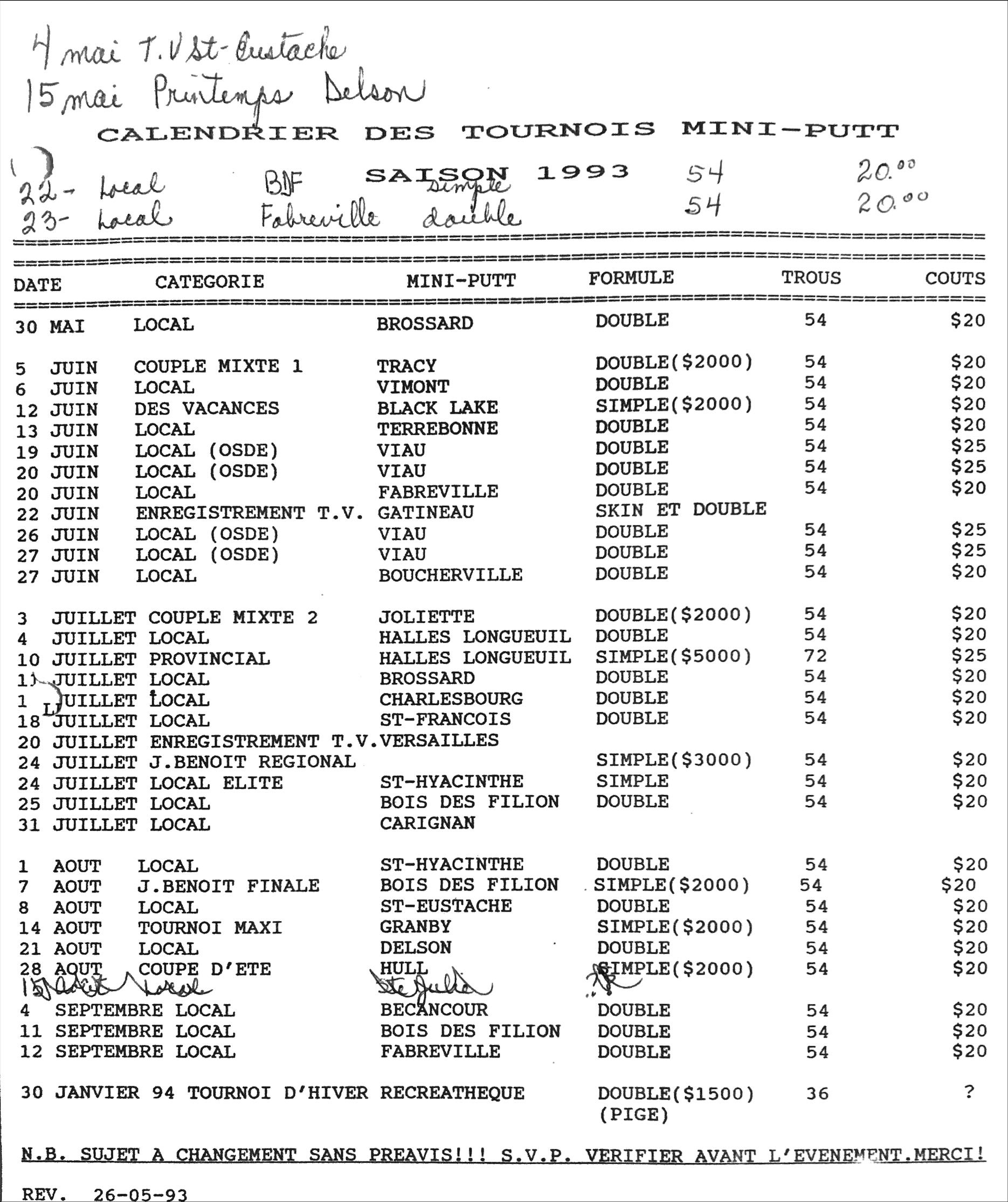 Calendrier des tournois de la saison 1993