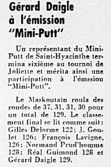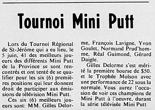 📝Le Courrier de St-Hyacinthe, 9 juin 1971, D. Sports: 1er tournoi régional de la saison servant de qualification télé pour les 6 premiers. Note: Il s'agit de la première victoire recensée pour Delorme, qui lui permettra de se qualifier pour la télé et d'en sortir vainqueur à l'issue de la saison 1971. Le nouveau clairon, 23 juin 1971: Deuxième source qui spécifie St-Jérôme. Le petit journal, 23 mai 1971, Sport: Annonce du premier tournoi régional à Joliette (sic).