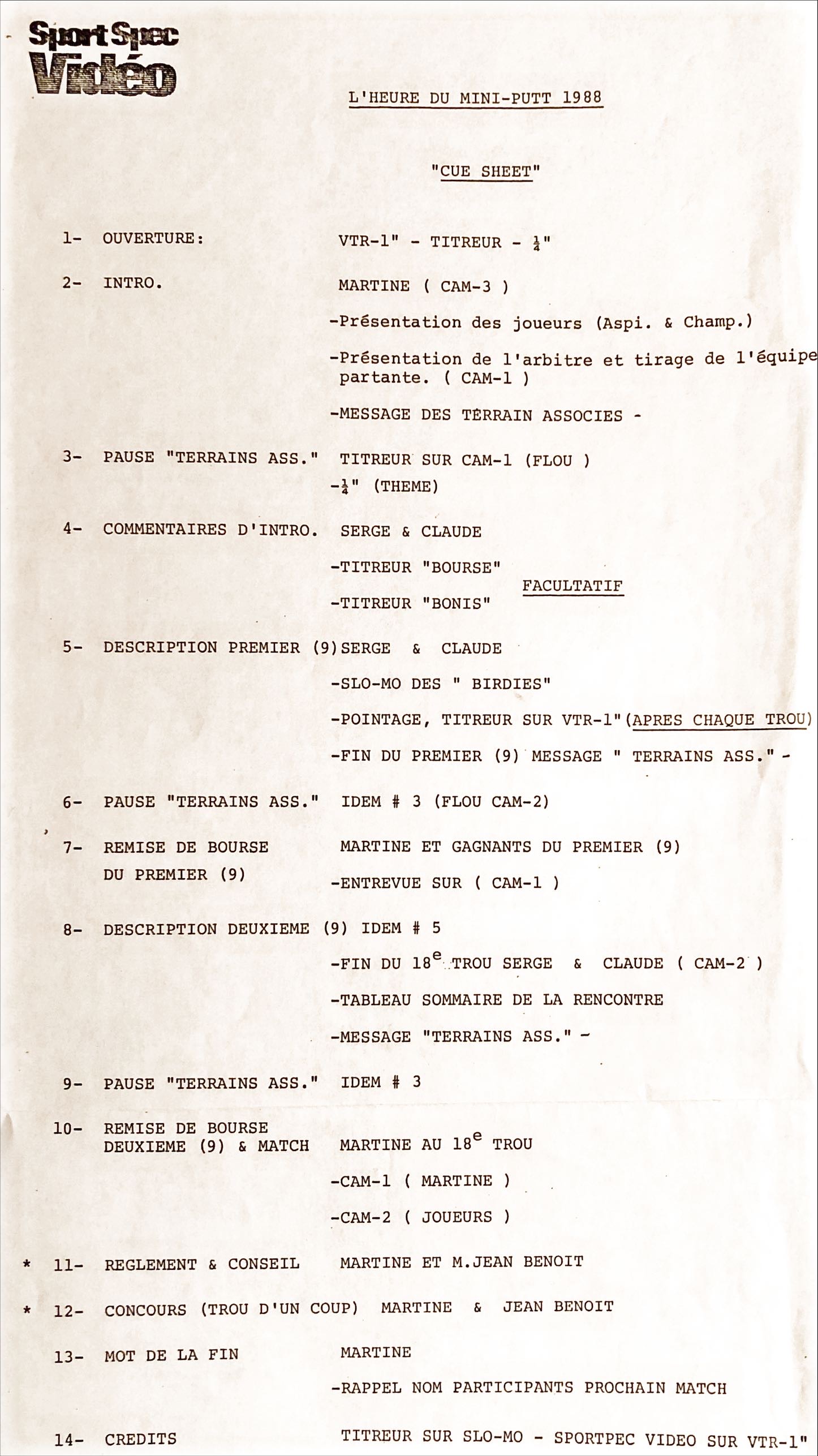 Cue sheet de l’Heure du mini-putt 1988